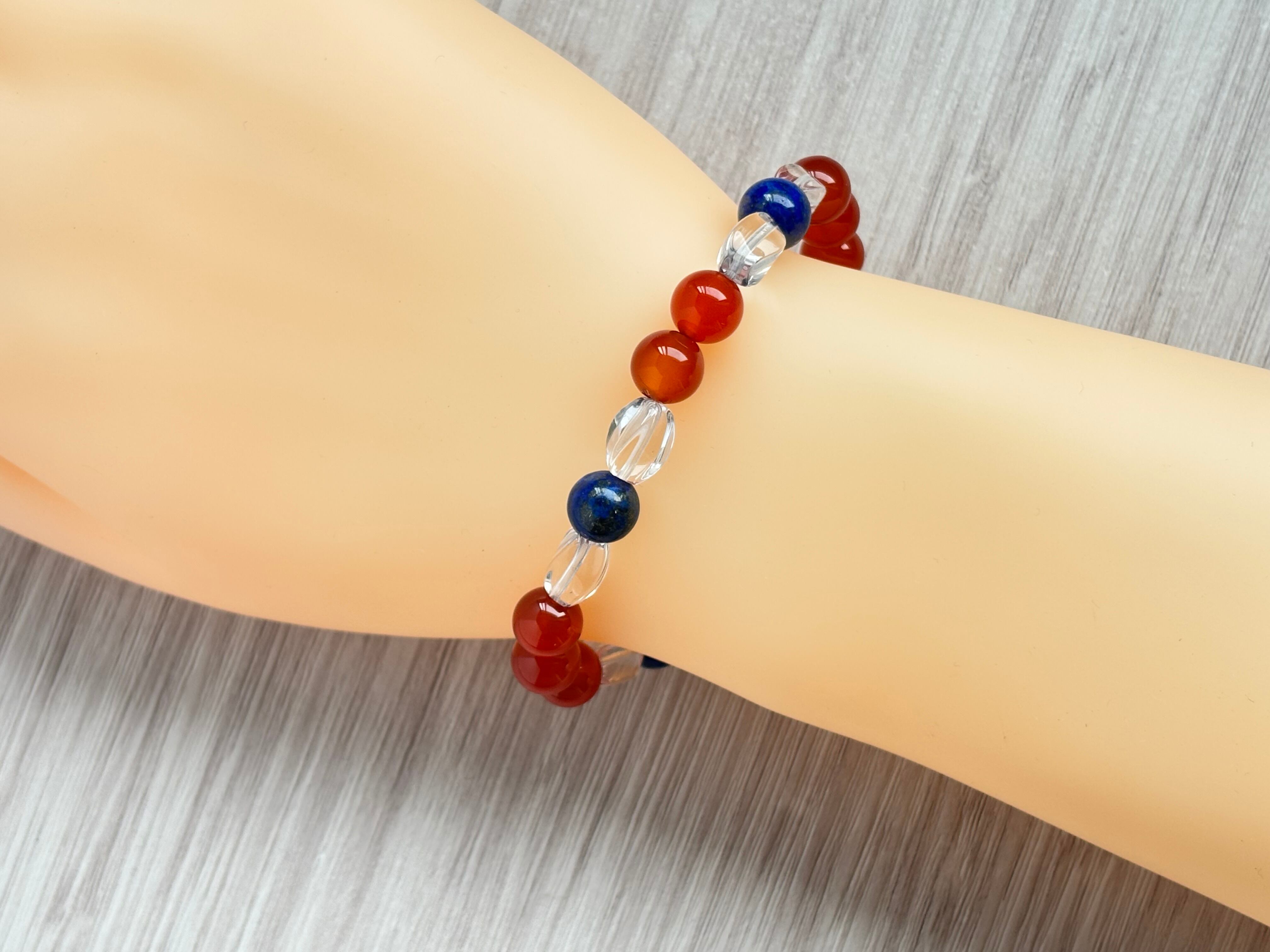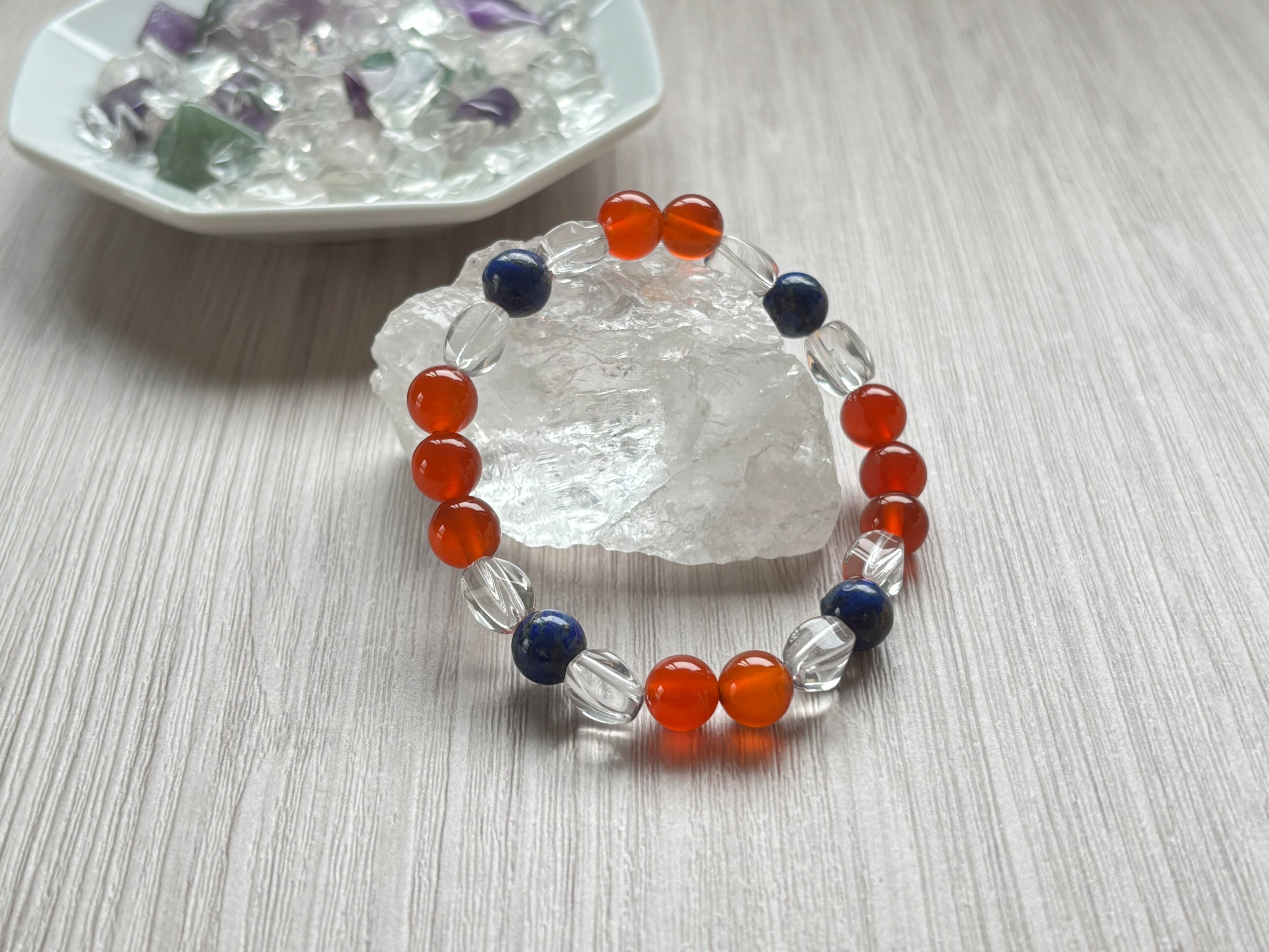 力強さを象徴するカーネリアン、深い知恵を宿すラピスラズリ、そして清らかな水晶。この3種の石が織りなすエネルギーが、あなたの中に眠る可能性をそっと呼び覚まし,目的達成にサポートしてくれます。