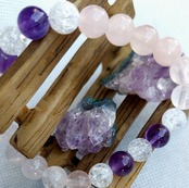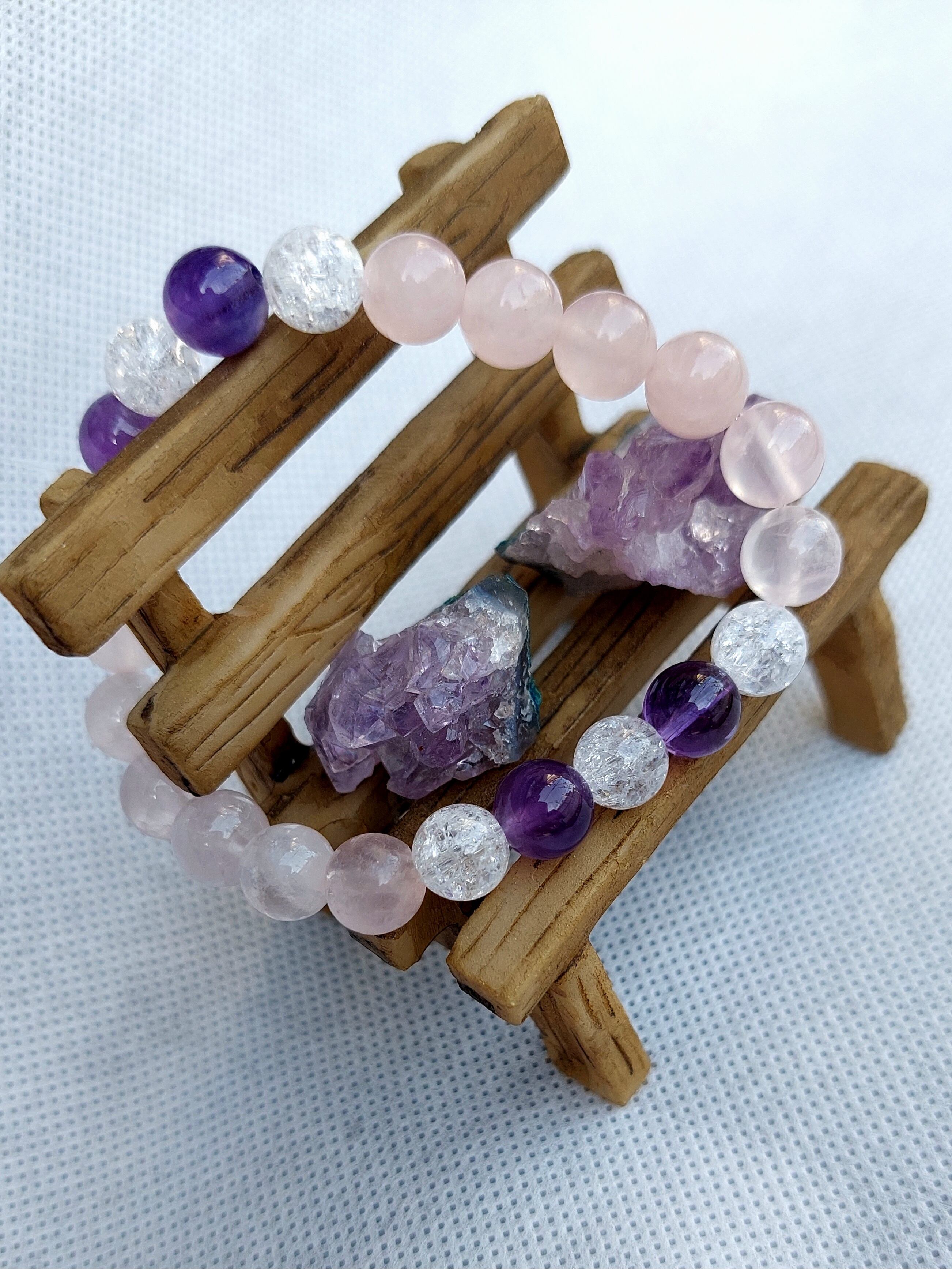 このパワーストーンブレスレットは、アメジスト、ローズクオーツ、そしてクラック水晶を使用しています。母の日の贈り物に大切な人への贈り物や、自分へのご褒美としても。
